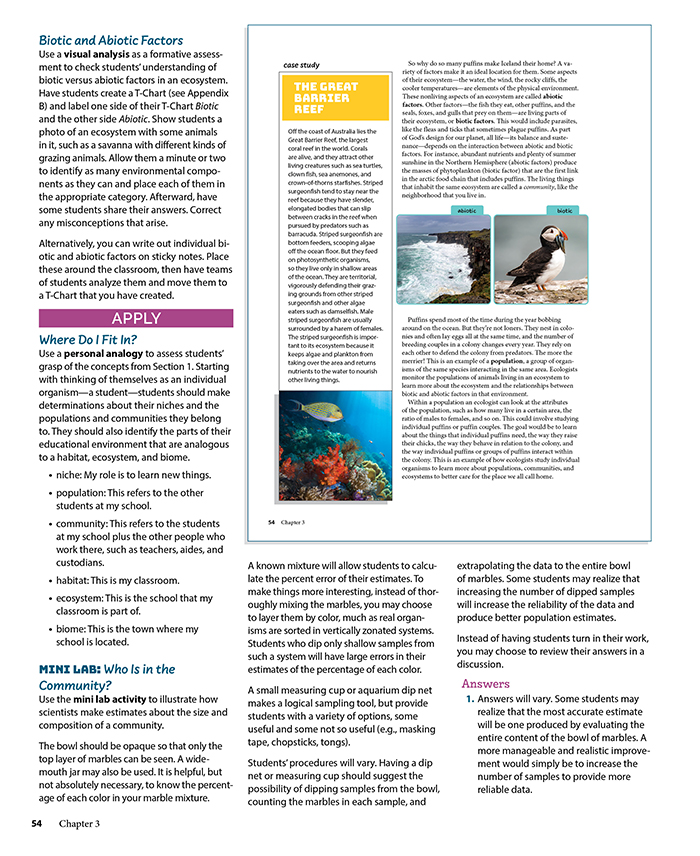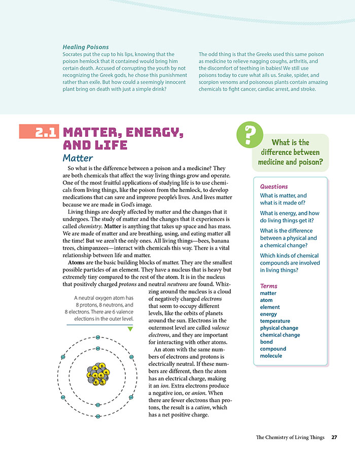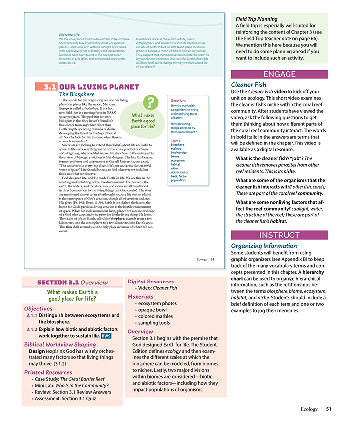 Numerous realistic scenarios will help students connect biological systems and processes with everyday events. Worldview investigations and ethics discussions will also help them see how a biblical worldview affects scientific evidence and determines which methods or procedures are appropriate. Ethics boxes in the student edition also explain complex, controversial issues in biology from a biblical perspective.