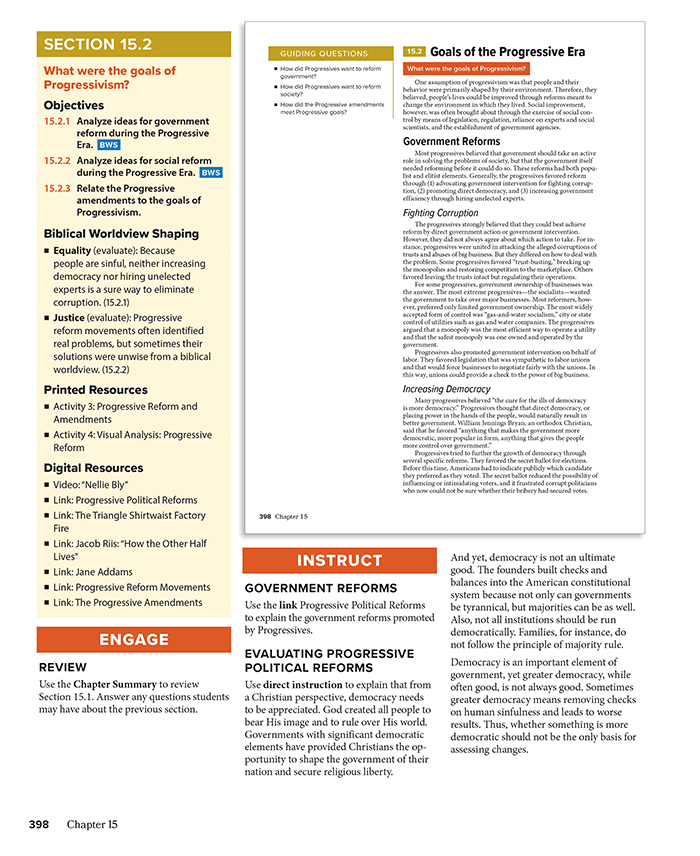 With teaching strategies for every stage of the teaching cycle (engage, instruct, apply, assess), the teacher edition provides educators with clear instructions on creating meaningful learning experiences that make history come alive. Biblical worldview shaping objectives encourage students to apply biblical principles to their view of history. Differentiated instruction strategies are flagged and color-coded to stand out.