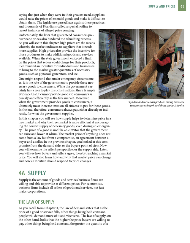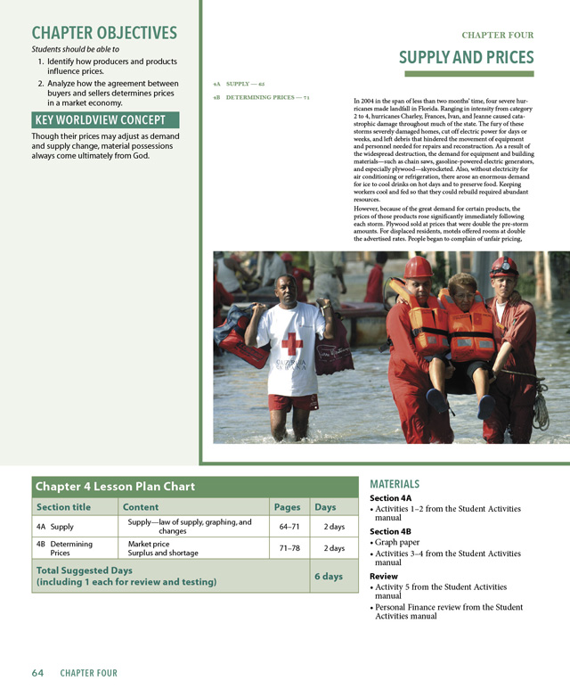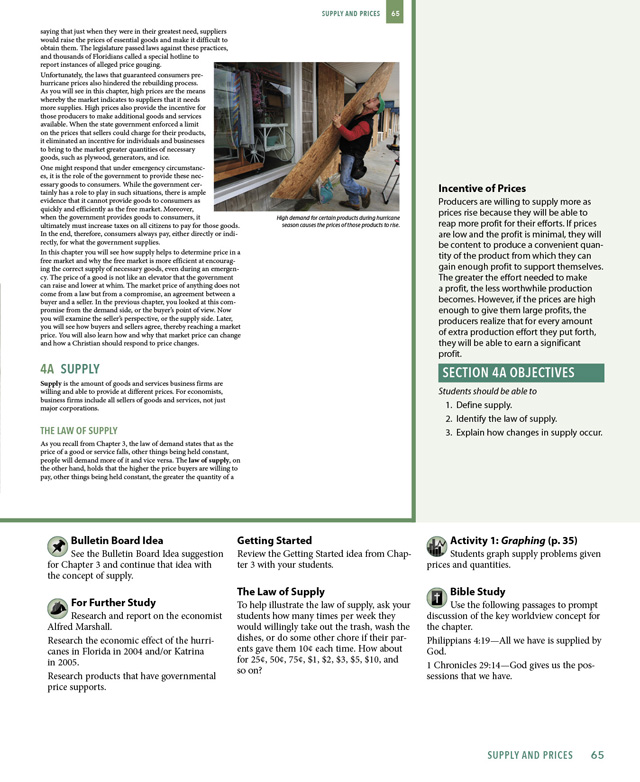 Each chapter contains information about personal finances and encourages a Biblical view of stewardship. Students are encouraged to think critically about economic issues. Economics focuses on the financial concerns of the country, business, and home, and applies Scriptural principles to all areas. The text promotes free market ideals over government intervention in the economy. It also explains business competitions, unemployment, productivity, investments, and inflation.