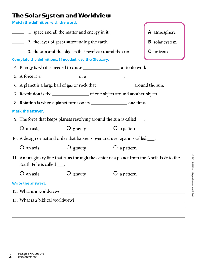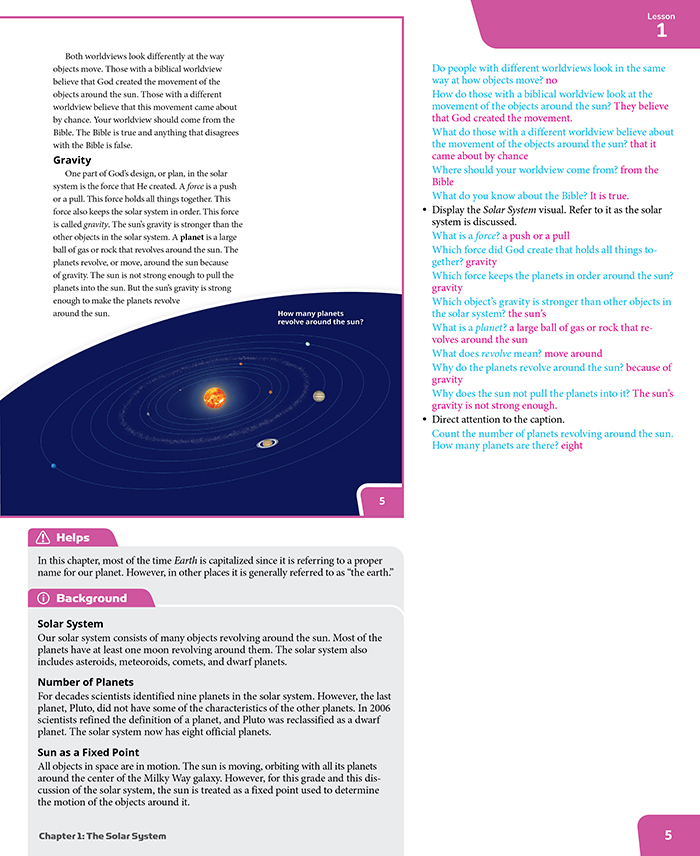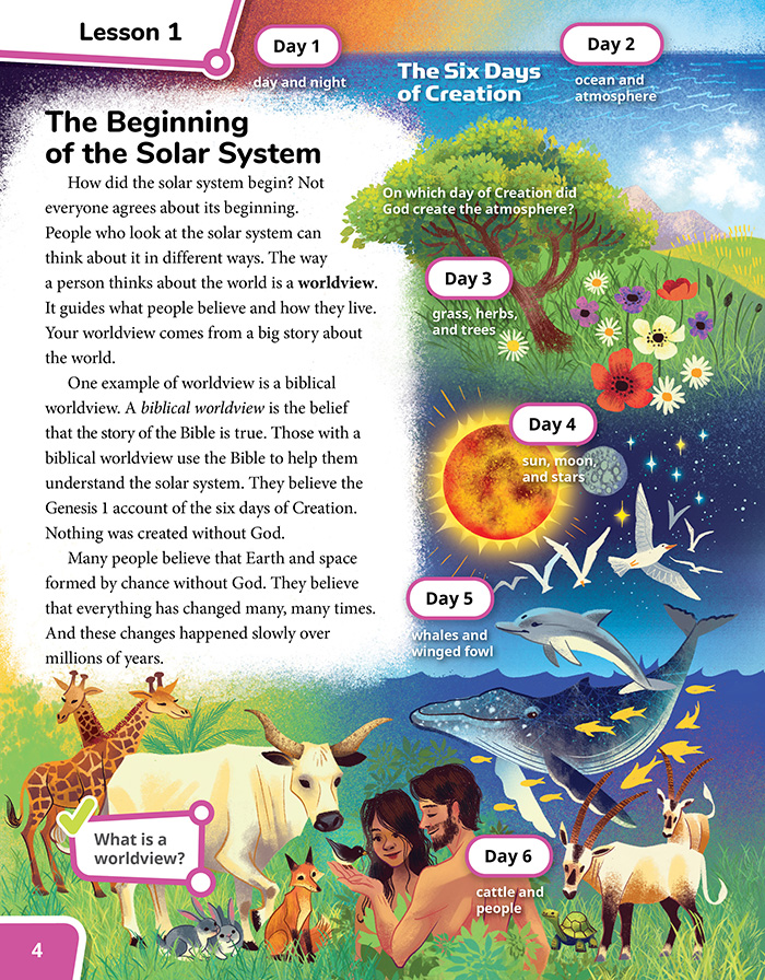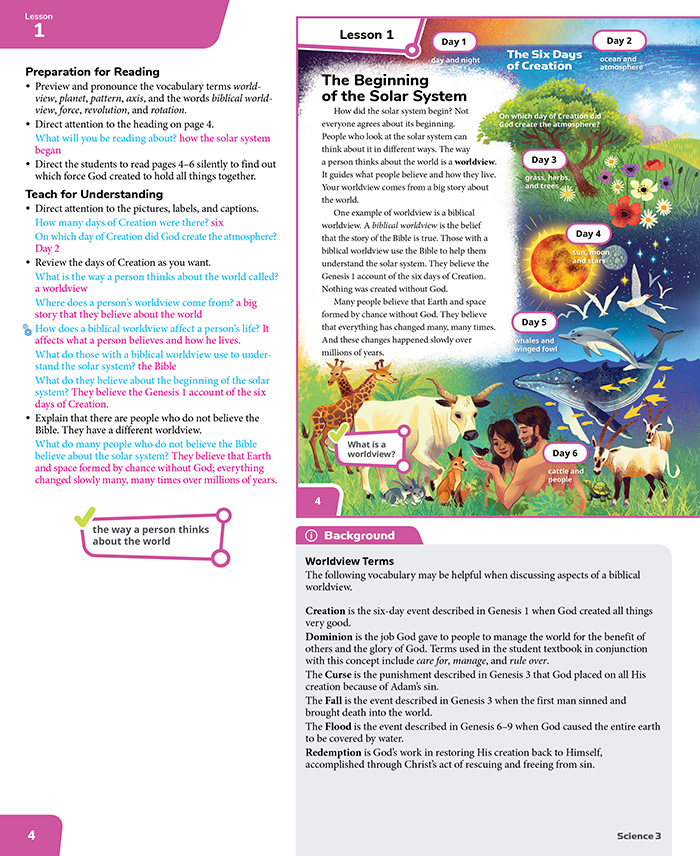 All lessons are presented within a Biblical worldview to help your child develop a fascinating, loving knowledge of God. Furthermore, the curriculum encourages the development of critical-thinking skills. Science process skills are introduced through participation in hands-on activities and projects.