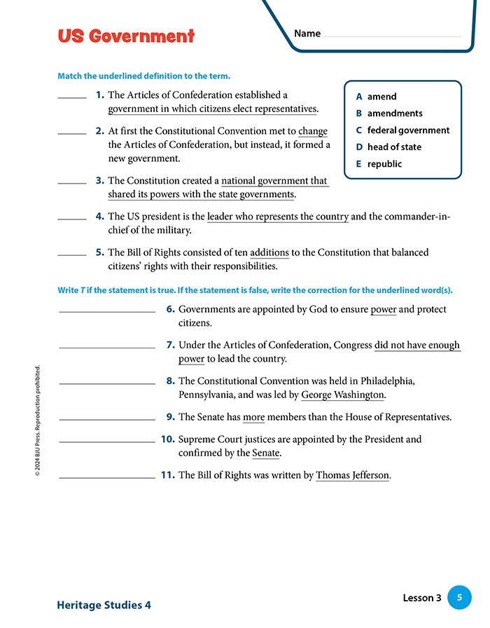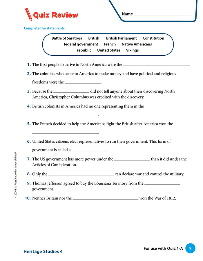 Heritage Studies 4 enables students to summarize American history as well as analyze the cultures of America’s states, regions, and territories. Students will learn to examine individual actions, pivotal decisions, and cultural movements from a biblical worldview. This course also teaches students to assess the impact of the Christian faith on American culture and form a biblical worldview on the topics of environment, citizenship, and economics.