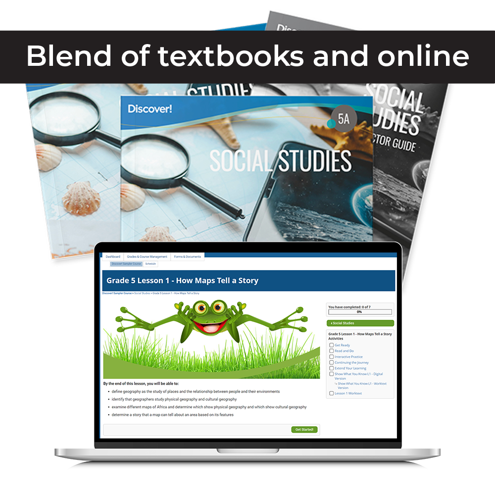Discover! Social Studies Grade 5 combines online learning, workbook-based lessons, and guided instruction to help students become young geographers. In partnership with Bridgeway Academy, daily online lessons explore how geography shapes culture and society.