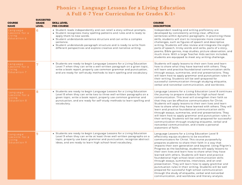 Language Lessons for a Living Education Level 6 incorporates picture study, memorization, grammar and punctuation, spelling and vocabulary, observation, and application through creating stories through pictures, sentences, paragraphs, poems, proverbs, book reports, and a letter. This course also develops reading and narration skills. By the end of the course, students should be able to comfortably write various types of paragraphs.