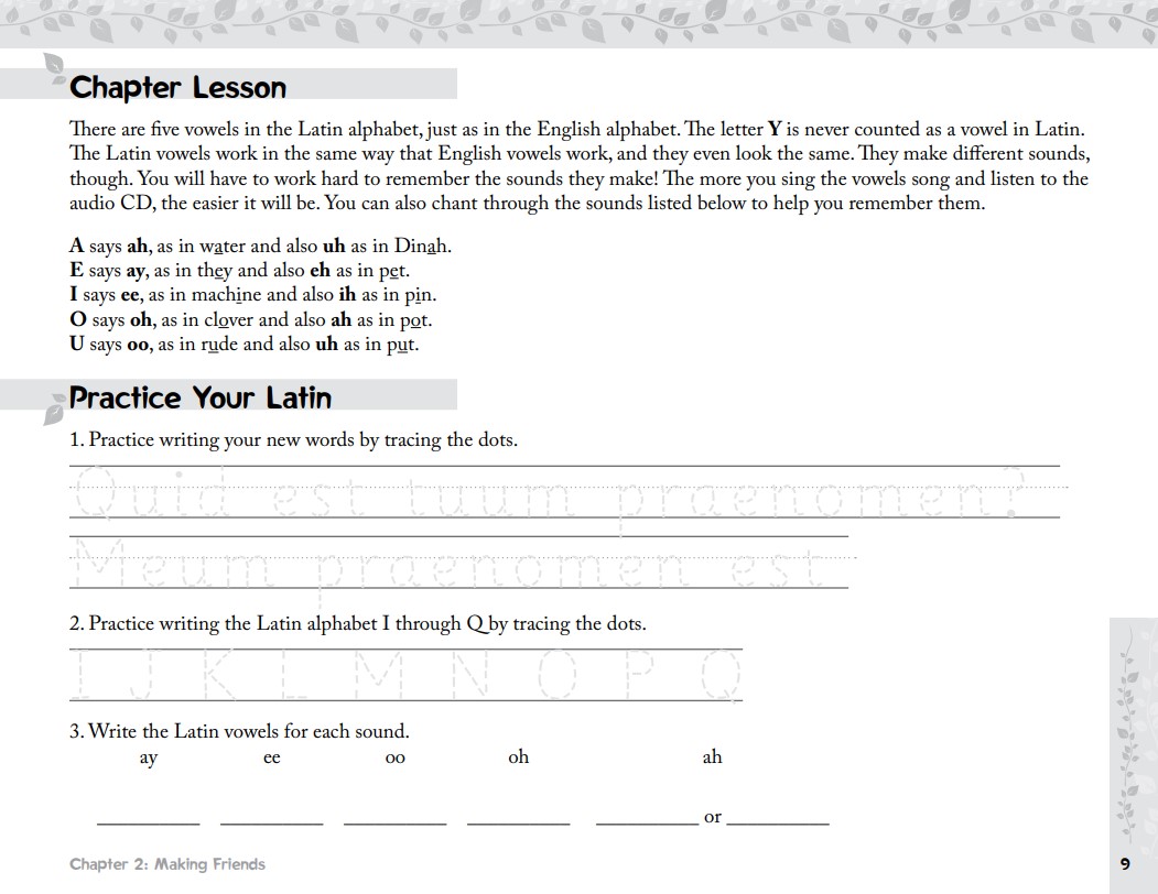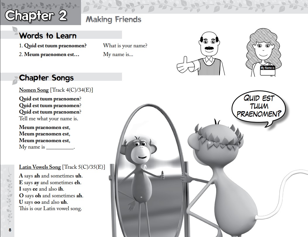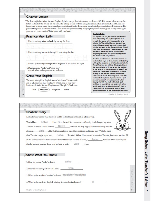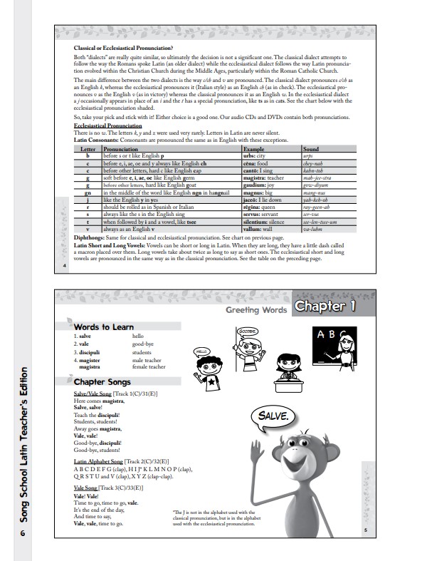 • Song School Latin Book 1 Teacher’s Edition This teacher’s edition includes the full content of the Song School Latin Book 1 student edition, as well as extra reproducible activity pages for each chapter, answer keys, additional teacher’s notes, and fun ideas for interactive classroom activities.